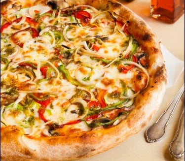 Pre: Classic marinara base with green peppers, grilled onions, mushrooms, tomatoes & chickpeas.